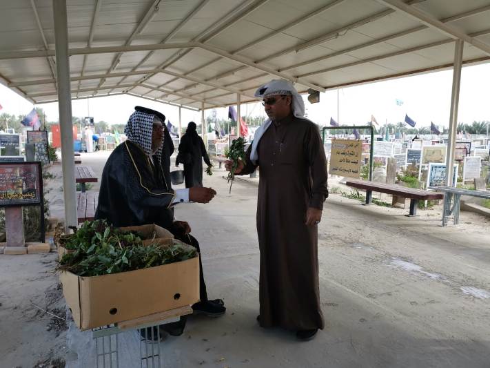 واعتاد الرجل بهيئته العراقية منذ عامين على التواجد في مقبرة تاروت يوم الجمعة من كل أسبوع، لتوزيع أعواد الريحان وشتلات الورد الأحمر أحيانا.