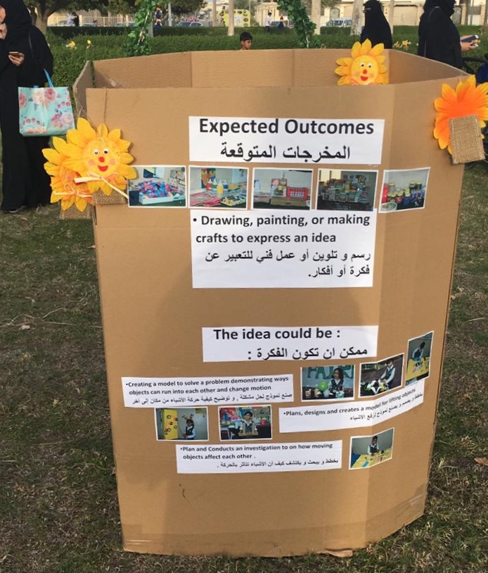 وأضافت إنه قد يكون المشروع أيضًا ذو أساس علمي ليصنع نموذجًا لحل مشكلة ويوضح كيفية حركة الأشياء من مكان لآخر، لكي يبحث الطفل ويستكشف كيف تتأثر الأشياء بالحركة أو بإمكانه تخطيط وصنع نموذج لرفع الأشياء.