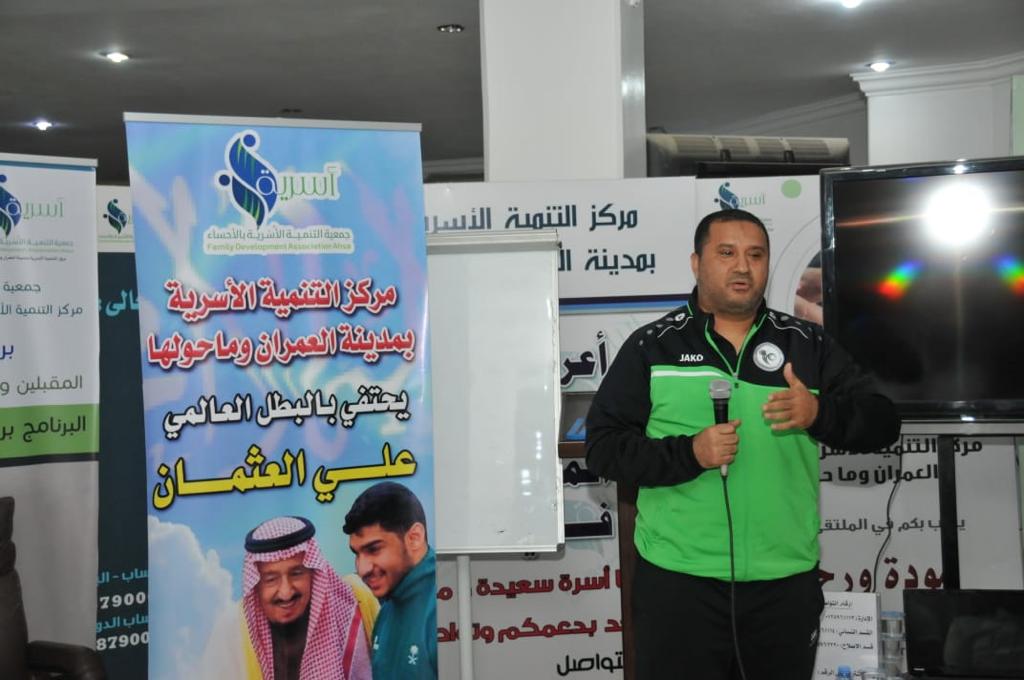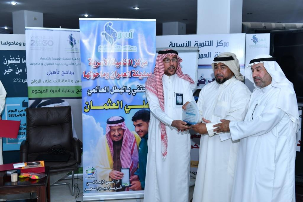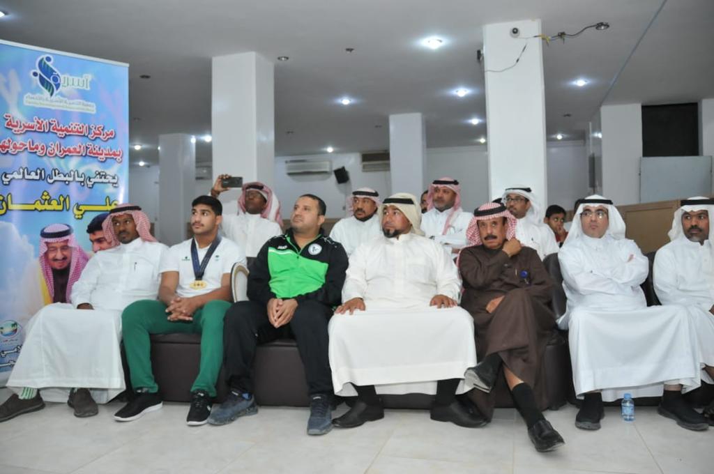 نظم مركز التنمية الأسرية بمدينة العمران وماحولها حفلاً للاحتفاء ببطل العالم للشباب في رفع الأثقال الأحسائي علي العثمان وأسرته ومدربه طاهر الشيبة، وذلك في مقر المركز مساء أمس الثلاثاء بحضور نخبة من الإعلاميين والنشطاء والمهتمين بالشأن الرياضي والأسري.