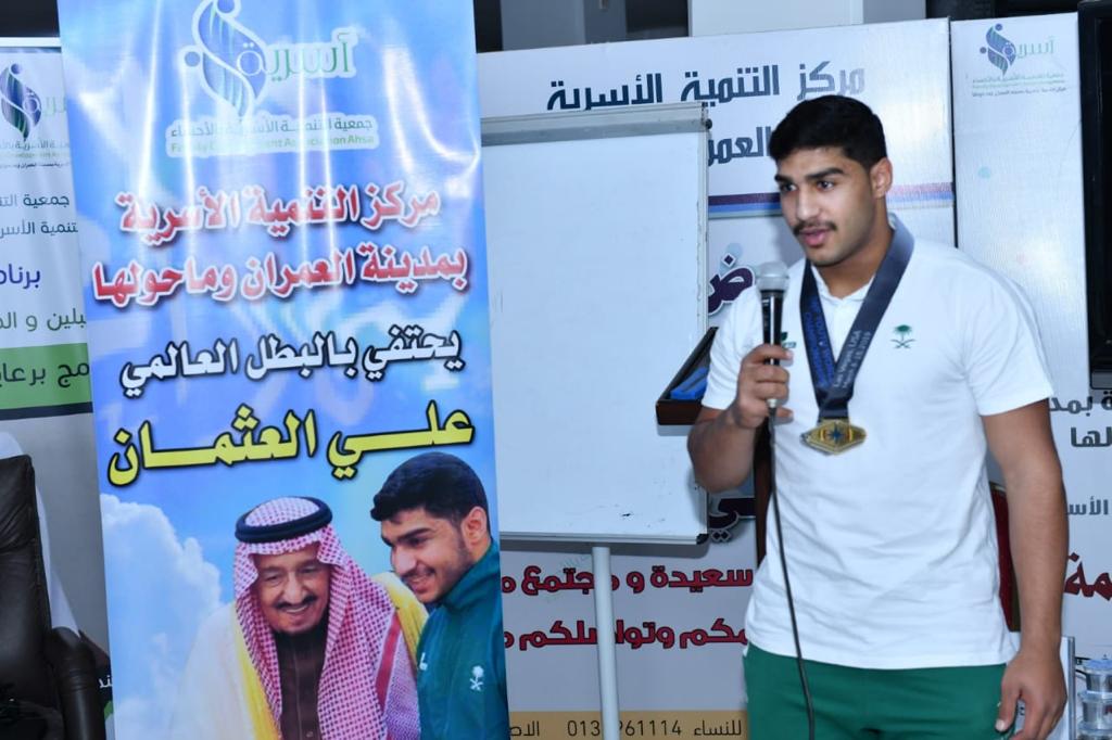 من جانبه شكر البطل العثمان مركز التنمية الأسرية بمدينة العمران وما حولها لتنظيمه هذا الاحتفاء وكل من ساهم في ذلك، وعبر عن اعتزازه وافتخاره برفع راية التوحيد والسلام الملكي في المحافل الدولية.