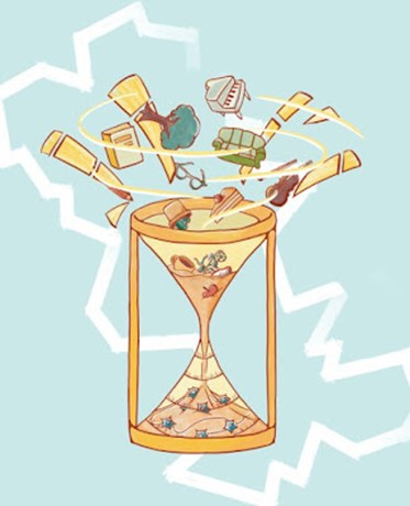 الصورة: تُستوعب الأحداث والممارسات الواعية experiences [وهي التجارب والخبرات والمعارف والمهارات والمعلومات المكتسبة وما هنالك [5] ] الجديدة في التمثيلات العصبية بمرور الزمن، ويُرمز إليها هنا بساعة رملية على شكل سطح زائدي hyperboloid. المصدر: معهد سالك