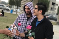 متطوعون يوزعون الورد في القطيف بمناسبة «يوم المحبة»