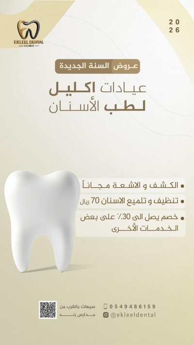 عيادات اكليل لطب الأسنان تقدم لكم عروض السنة الجديدة ✨ 2026 ✨ ⁃ الاستشارة والفحص المجاني ⁃ تنظيف وتلميع الأسنان: 70 ريال ⁃ خصم 30% على خدمات اخرى نهدف إلى تقديم افضل خدمة علاجية من خلال طاقم طبي سعودي ذو كفاءة عالية. 🦷 ... |