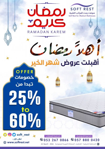 ”سوفت رست للمراتب الطبية“ عروض رمضانية من 25% إلى 60% الانستغرام: https://instagram.com/soft_rest السناب: https://t.snapchat.com/djF31Q6O موقعنا: ... |
