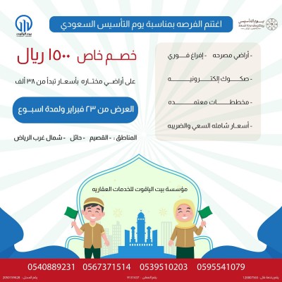 ”بيت الياقوت للخدمات العقارية“ فرصة استثمارية لك وللمستقبل أراضي سكنية وتجارية مصرحة تبدأ من 38 ألف ريال في : القصيم - حائل - شمال غرب الرياض خصم 1500 ريال على اراضي مختارة العرض من 23 فبراير لمدة أسبوع موقعنا: تركيا الصناعية - شارع عمار بن ياسر ... |