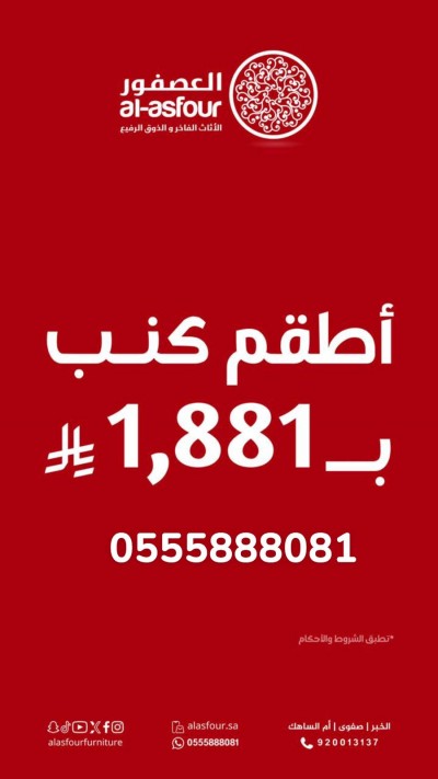 عروض مفروشات العصفور مذهلة وتشمل الفرعين لمعرفة جديدنا تابعونا على الانستغرام: https://www.instagram.com/alasfourfurniture تسوق مع العصفور أون لاين: alasfour.sa وقسّم فاتورتك مع تابي أو تمارا بدون فوائد وبدون رسوم. أوقات الدوام: ... |