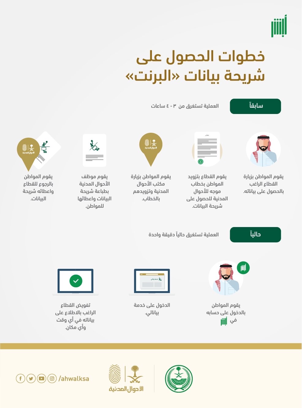 وأشارت ”الأحوال المدنية“ إلى أن الخدمة كانت تشترط في السابق زيارة المواطن للقطاع الراغب بالحصول على بياناته، والانتظار حتى يقوم موظف الأحوال المدنية بطباعة البيانات وإعطائه للمواطن، مما كان يؤدي إلى احتياج الأمر من 3 إلى 4 ساعات.