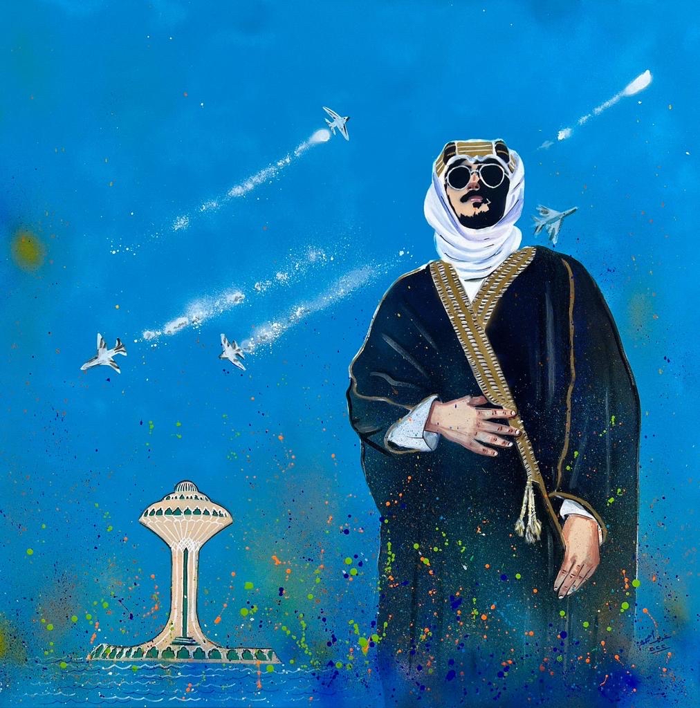ووصفت المبارك عملها باللوحة ”الزرقاء“ بأنه يعبر عن رؤية المملكة والنجاح والفخر بعيون الشاب السعودي، ويتضمن برج الخبر واستعراض الطيران الجوي، للدلالة على القوة ومواكبة التطور.