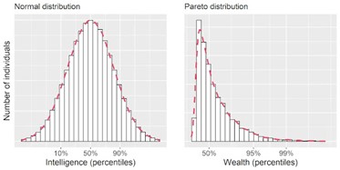 لذا فإن الذكاء والتعليم والحالة السيسيواقتصادية [23] جميعها تؤثر في دخل الفرد. ومع ذلك، فمن غير المرجح أن تكون هذه العوامل وحدها هي السبب في التفاوت بين الأفراد من ناحية الثروة. في الواقع تشير دراسة نشرت في 2018 إلى أن الحظ له تأثير كبير[25] . هذه الدراسة سلطت الضوء على أن التوزيع الإحصائي «الاحتمالي» للثروة يختلف عن التوزيع الاحتمالي للذكاء. ”التوزيع الاحتمالي للذكاء هو توزيع احتمالي طبيعي «التوزيع الغاوسي [26] “، حيث ذكاء معظم الناس يتراوح قريبًا من متوسط قوس التوزيع distribution curve. وعلى النقيض من ذلك، الثروة تقتفي ”قوس توزيع باريتو الاحتمالي [27] 0“ وهو الصيغة التي تُثْبت أن 80٪ من ثروة أي دولة تقع في أيدي 20٪ فقط من سكانها.