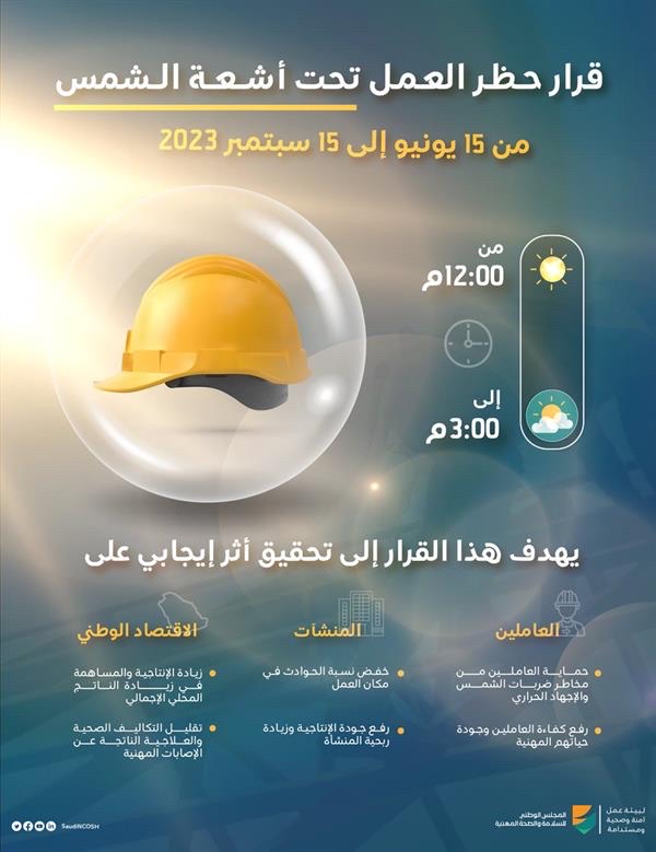 أصدرت وزارة الموارد البشرية والتنمية الاجتماعية قرارا يحظر العمل تحت أشعة الشمس من الساعة 12 ظهراً إلى الثالثة مساء وذلك اعتبارا من يوم 15 يونيو وحتى 15 سبتمبر 2023