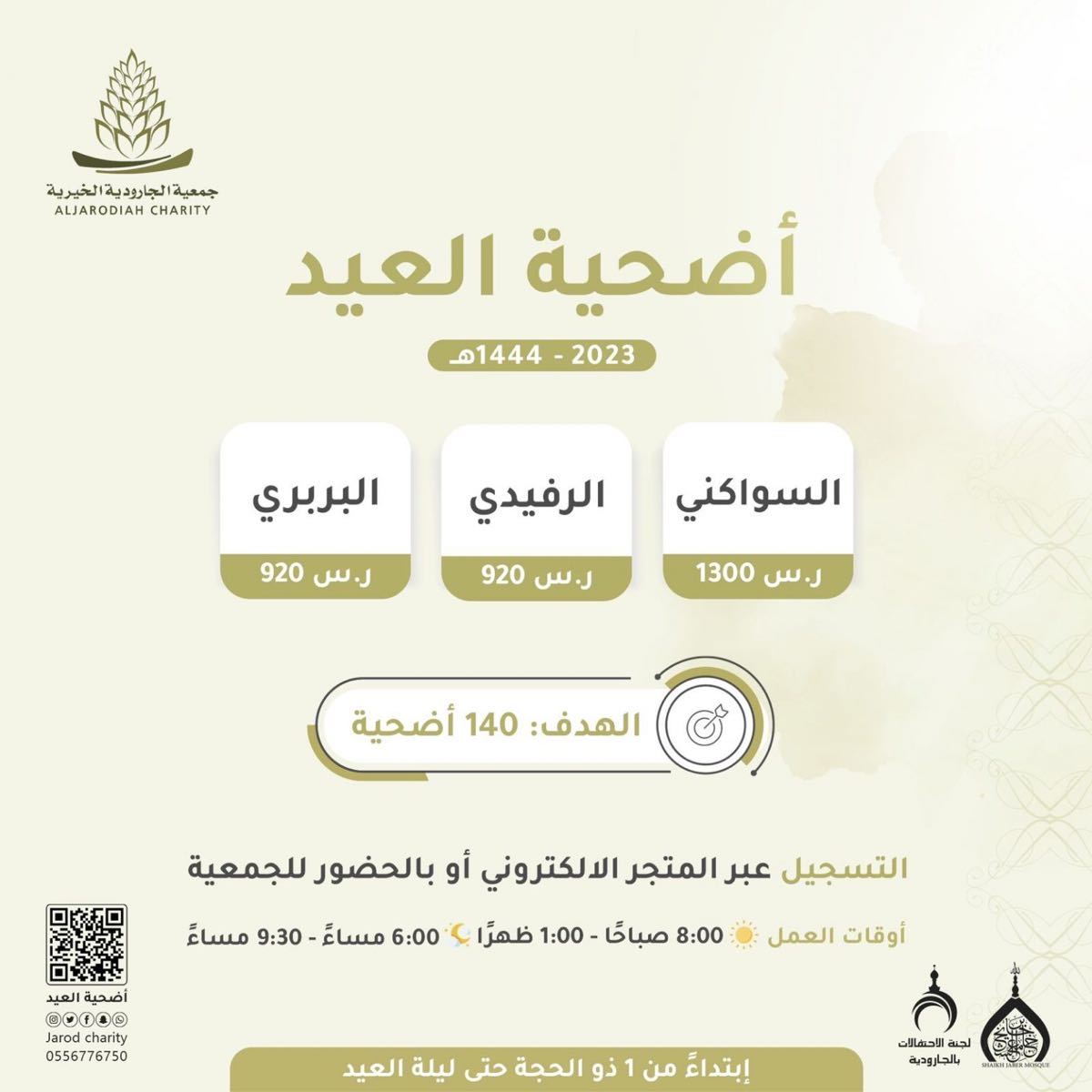 أعلنت جمعية الجارودية الخيرية في محافظة القطيف جاهزيتها لاستقبال التسجيل في برنامج أضحية العيد للعام 1444ه.