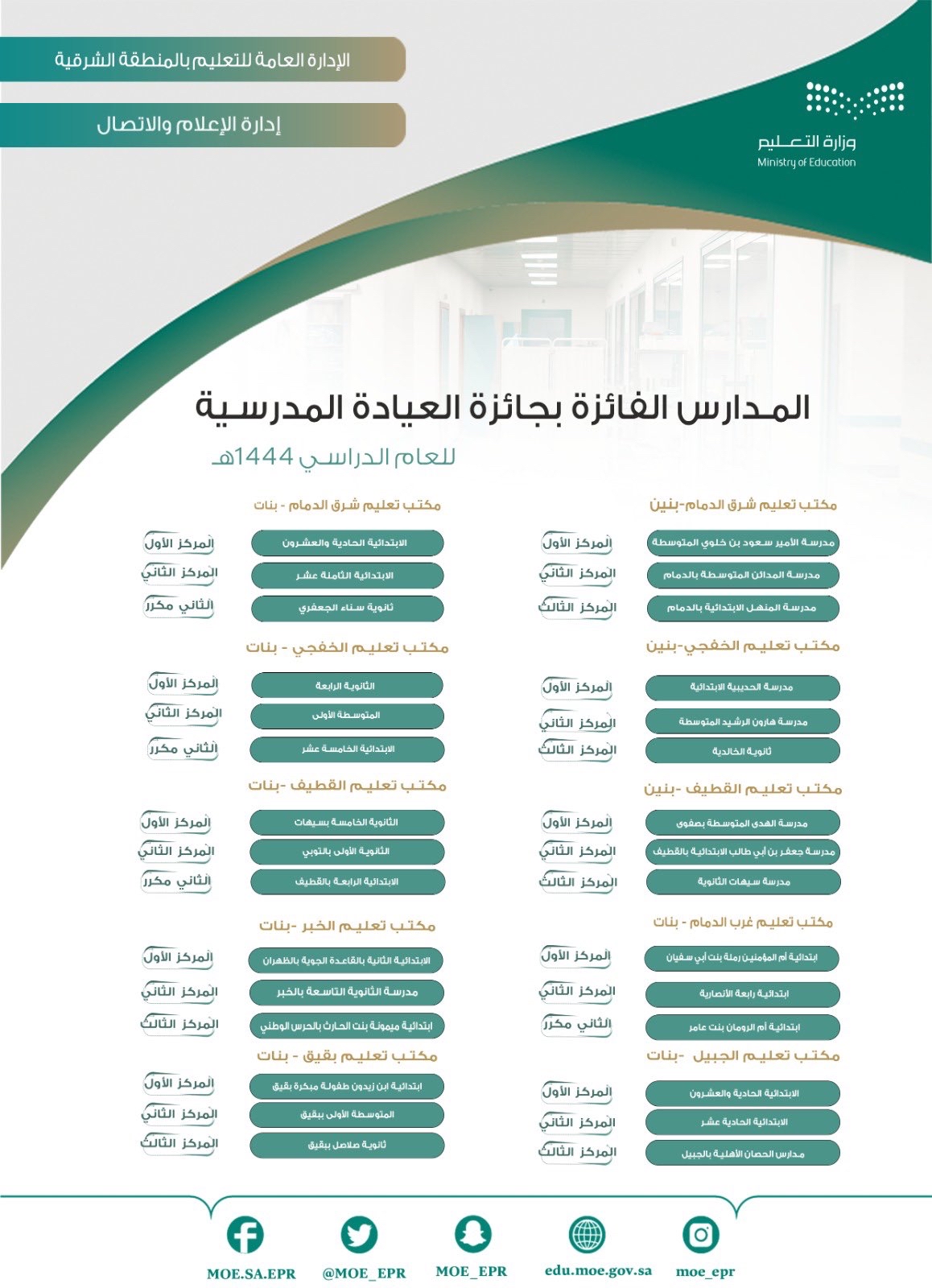 حصلت مدرسة الابتدائية الحادية والعشرون على المركز الأول والابتدائية الثامنة عشر على المركز الثاني، والثانوية سناء الجعفري على المركز الثاني مكرر بإدارة تعليم شرق الدمام «بنات».
