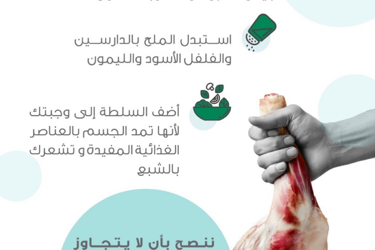 ونصحت بإضافة السلطة إلى الوجبة، لأنها تمد الجسم بالعناصر الغذائية المفيدة فضلاً عن الشعور بالشبع عند تناولها، لافتةً إلى أن الاحتياج اليومي للحوم يعادل 70- 90 غراما.