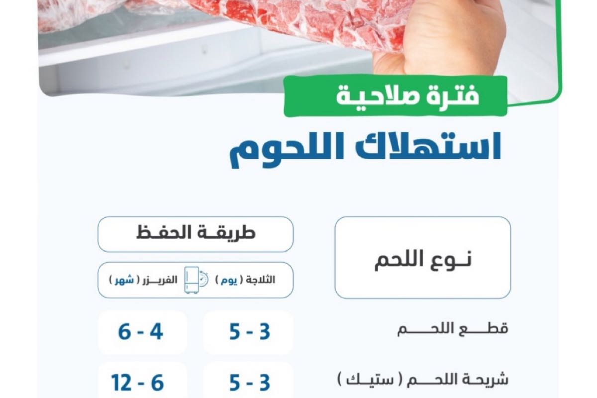 وأوضحت الهيئة أن صلاحية قطع اللحم المحفوظة بالثلاجة تمتد من 3-5 أيام أو 4-6 أشهر عند حفظها في الفريزر، فيما تمتد صلاحية شرائح اللحم ”الستيك“ من 3-5 أيام بالثلاجة أو 6-12 شهرا في الفريزر.
