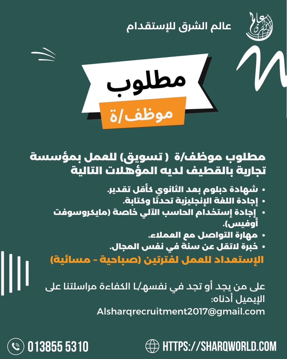 مطلوب موظف أو موظفة «تسويق» للعمل بمؤسسة تجارية بالقطيف لديه المؤهلات التالية: