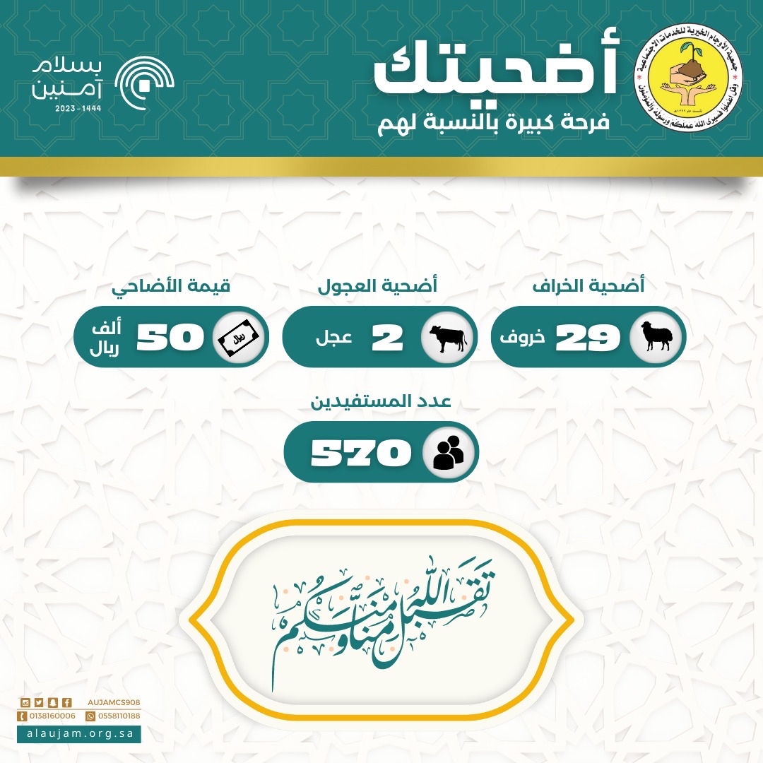 وأضاف المبارك أن المساهمة في الأضحية هذا العام 2023 زادت بنسبة 31% عن العام الماضي، حيث كانت قيمة الأضاحي للعام 2022,38 ألف ريال.