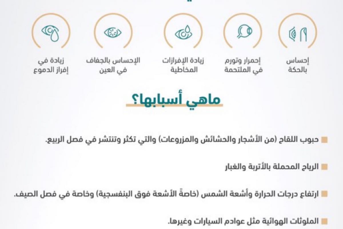 وأشارت إلى أن أسباب الإصابة بحساسية العين تتضمن حبوب اللقاح المنتشرة في فصل الربيع من الأشجار والحشائش والمزروعات، والرياح المحملة بالأتربة والغبار، وارتفاع درجات الحرارة وأشعة الشمس فوق البنفسجية في فصل الصيف، والملوثات الهوائية مثل عوادم السيارات وغيرها.