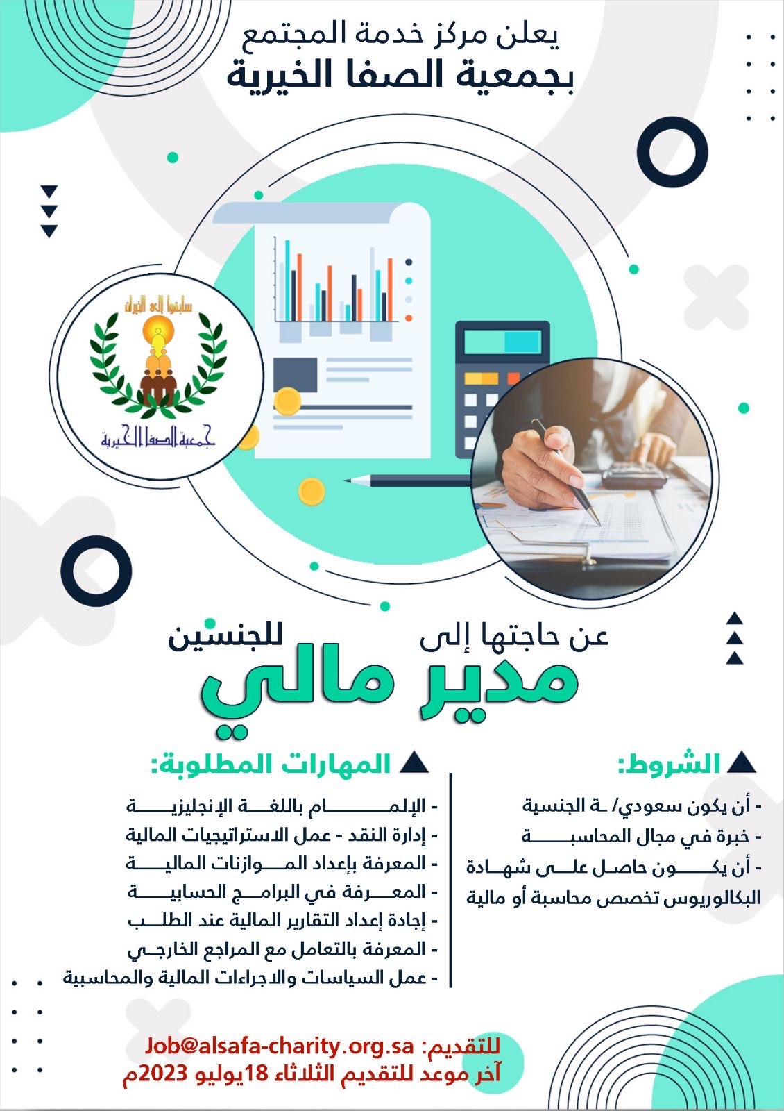 أعلن مركز خدمة المجتمع بجمعية الصفا الخيرية، اليوم الأربعاء، عن توفر وظيفة شاغرة لمدير مالي من الجنسين، وفقًا للشروط المحددة للوظيفة.