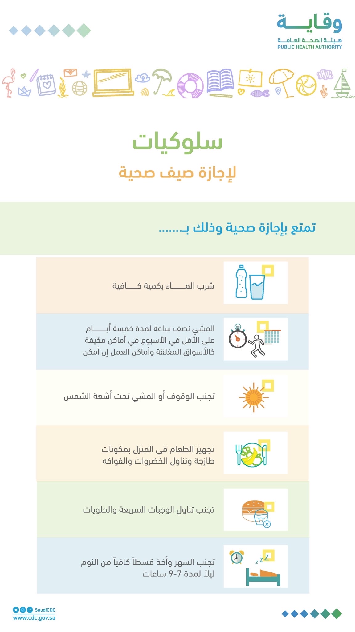 أصدرت هيئة الصحة العامة ”وقاية“ مجموعة من النصائح والإرشادات الهامة للمواطنين والمقيمين في المملكة، للاستمتاع بإجازة صيفية صحية وآمنة في ظل جائحة فيروس كورونا.