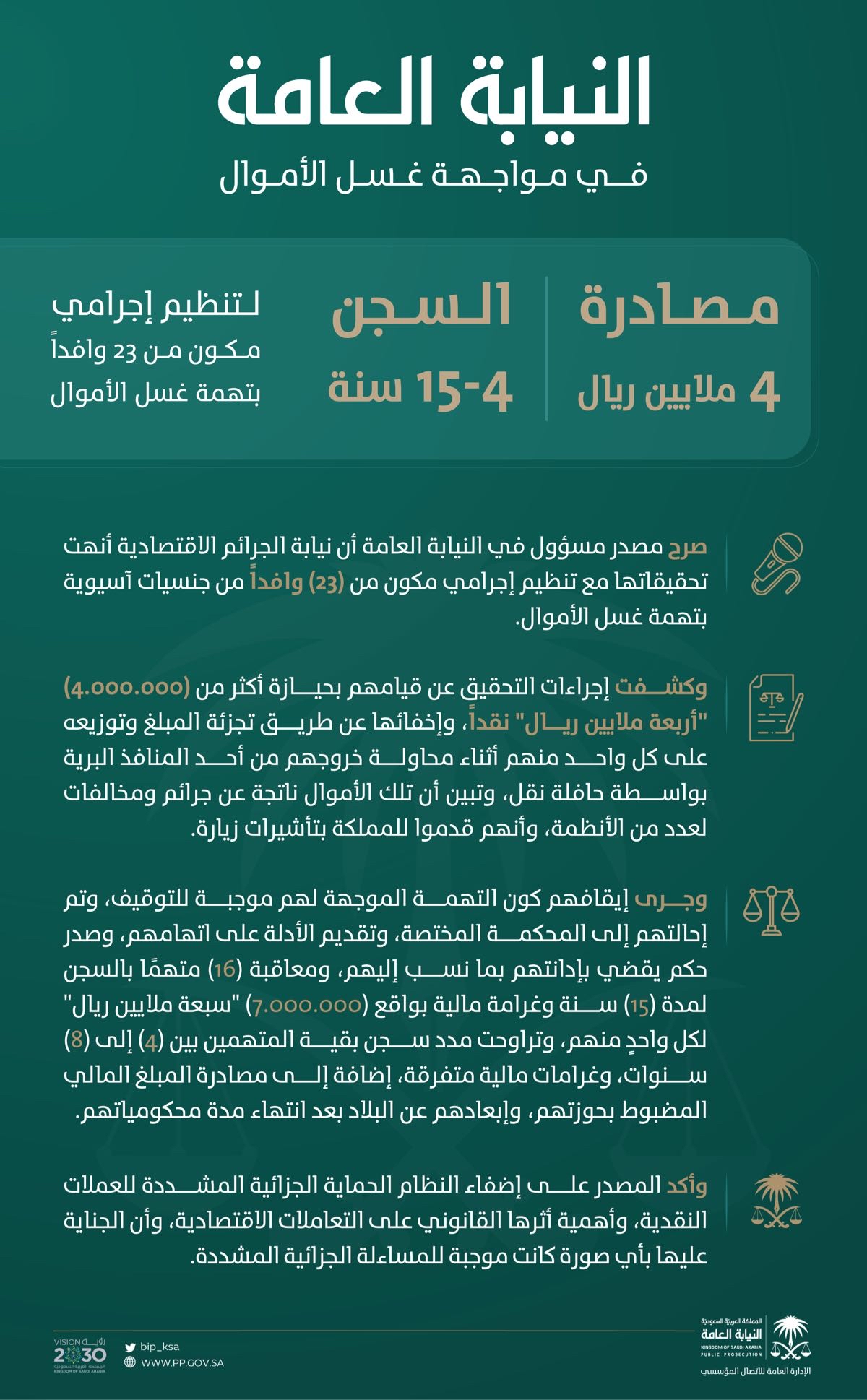 النيابة العامة: إدانة تنظيم إجرامي مكون من 23 وافدا بتهمة غسل الأموال