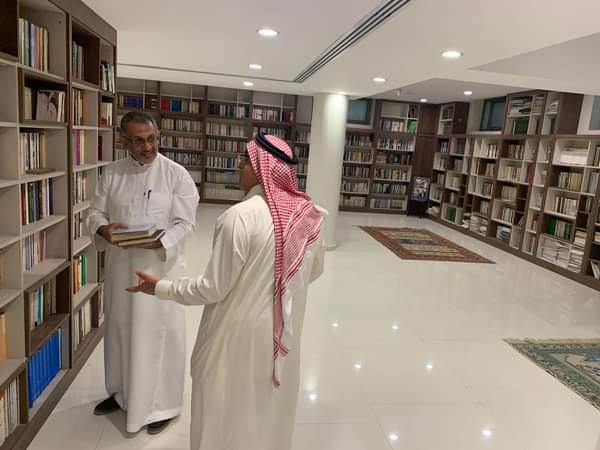 وإن يكن لك شيء من العجب، فلتعجب من تلك المكتبة الضخمة في منزله، والتي صحبتُه إليها في الدور السفلي من منزله الأنيق بذلك المصعد الزجاجي، والتي حوَت آلافًا من الكتب في كل أنواع الثقافة، وقد خصَّ ركنًا منها بالكتب المهداة إليه، كان من أبرزها إهداء توفيق الحكيم لكتابه «مختارات من تفسير القرطبي»، وكذلك إهداء من بدوي الجبل، وأحمد طالب الإبراهيمي، وغيرهم من مئات الكُتَّاب.