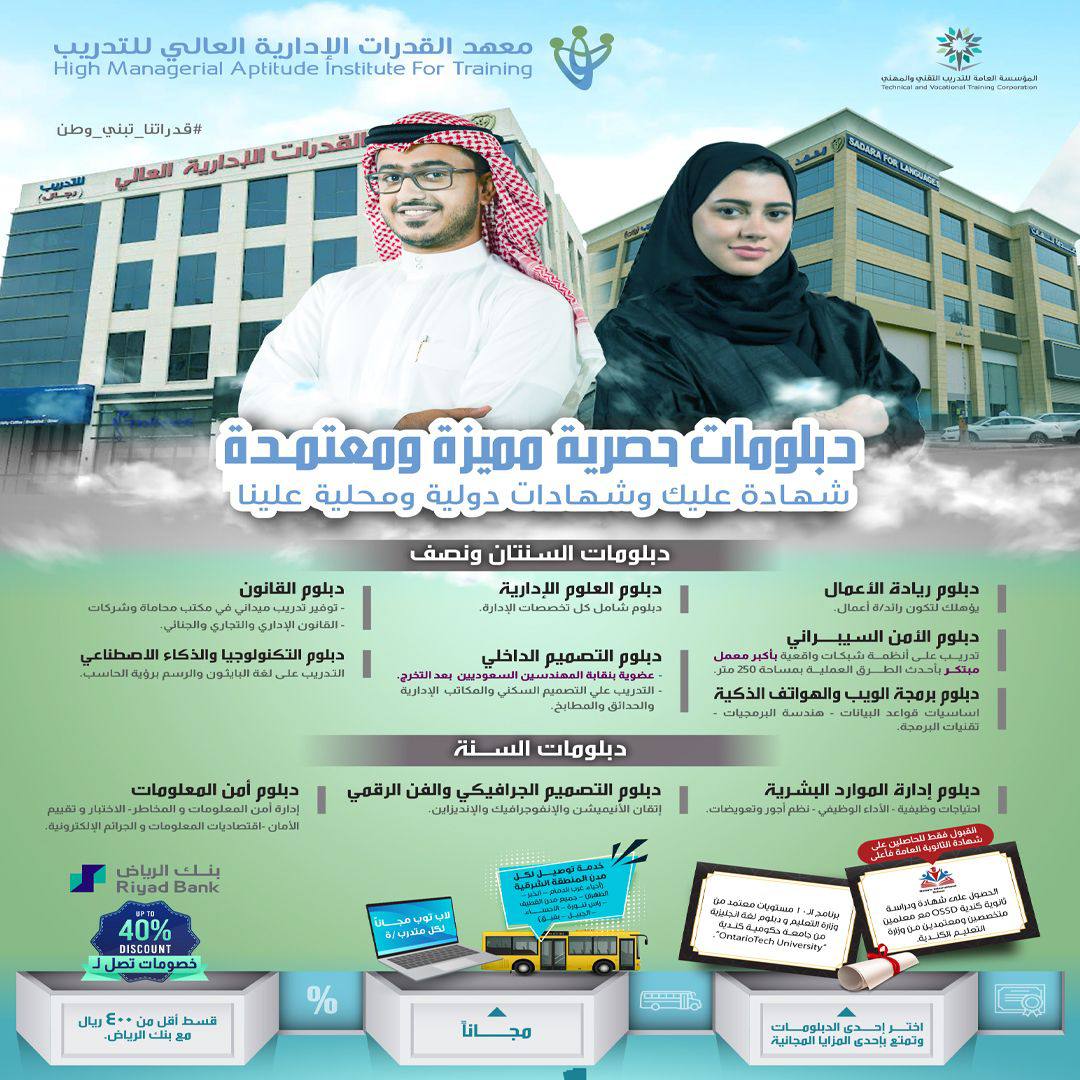 💸💰قسطك مريح، من غير رسوم إضافية وأقل من «400 ريال»، توفرها إتفاقية المعهد مع بنك الرياض.