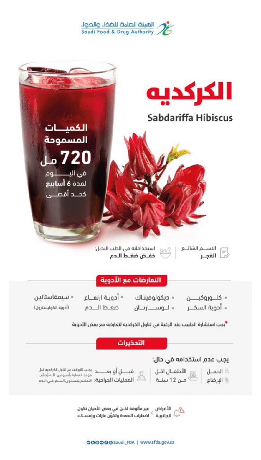 وأوضحت الهيئة أن الكمية المسموح بها من شرب مشروب الكركديه هي 720 مل يوميًا، ولمدة لا تتجاوز الستة أسابيع. ومع ذلك، قد يتعارض تناوله مع بعض الأدوية المهمة مثل ”كلوروكين“ و”ديكولوفيناك“ وأدوية ارتفاع ضغط الدم و”سيمفاستاتن“ وأدوية السكر لوسارتان وأدوية ضغط الدم وأدوية الكوليسترول.