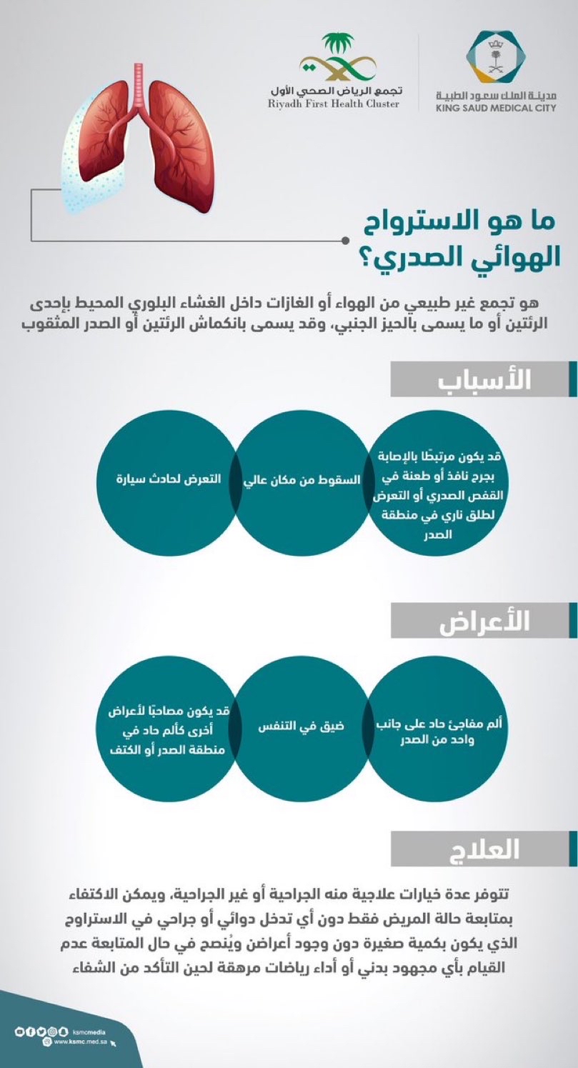 كشفت مدينة الملك سعود الطبية عن معلومات جديدة تتعلق بمرض الاسترواح الهوائي الصدري، حيث قدمت توضيحًا شاملاً لأسبابه وأعراضه وطرق علاجه.