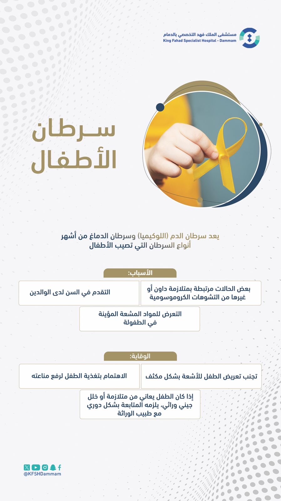 كشف مستشفى الملك فهد التخصصي بالدمام، أسباب إصابة الأطفال بسرطان الدم «اللوكيميا» وسرطان الدماغ تعود إلى التقدم في السن لدى الوالدين.