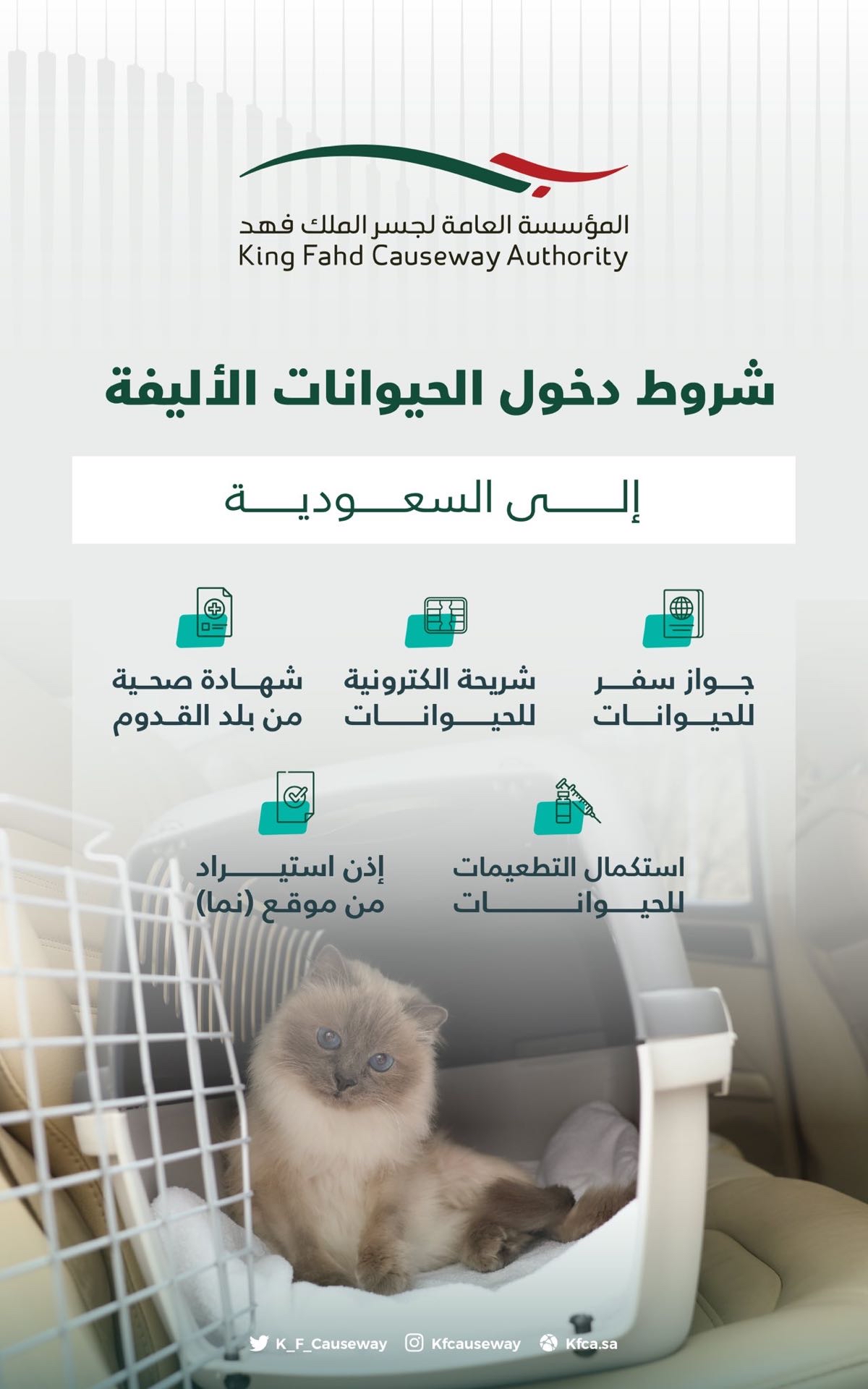 وأوضح جسر الملك فهد أن هناك 5 شروط يجب توافرها للقادمين من الخارج والراغبين في اصطحاب حيواناتهم الأليفة، حيث يتعين عليهم أولاً الحصول على جواز سفر خاص للحيوانات الذي يثبت هويتها وصحتها. وبالإضافة إلى ذلك، يجب أن تكون الحيوانات مزودة بشريحة إلكترونية تحمل بياناتها الشخصية وتاريخ تطعيماتها ومعلومات هامة أخرى.