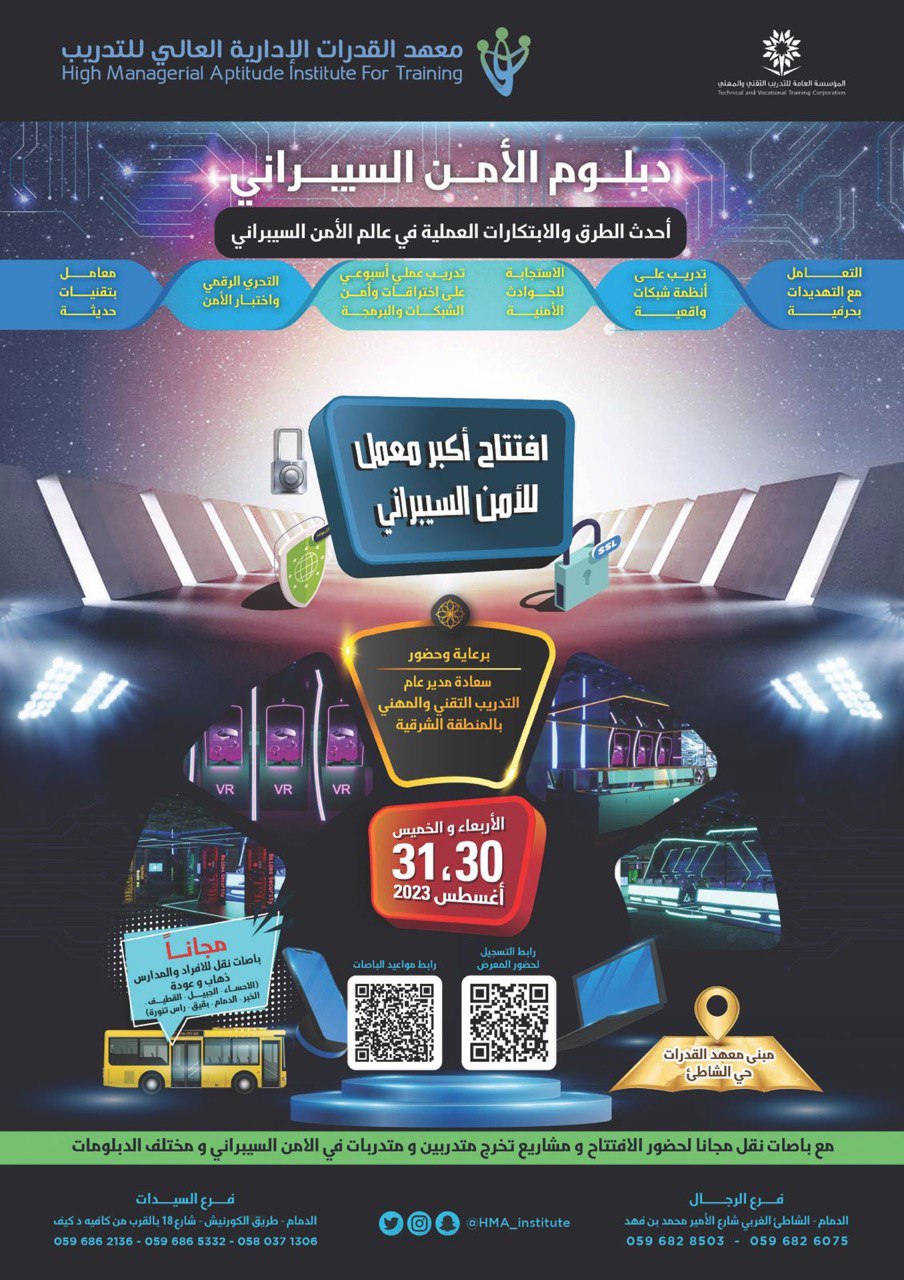 كما يمكنكم التسجيل والاستفسار عن العروض المذهلة على أكثر من «10» دبلومات عالية هي الأحدث والأقوى على مستوى المنطقة الشرقية.