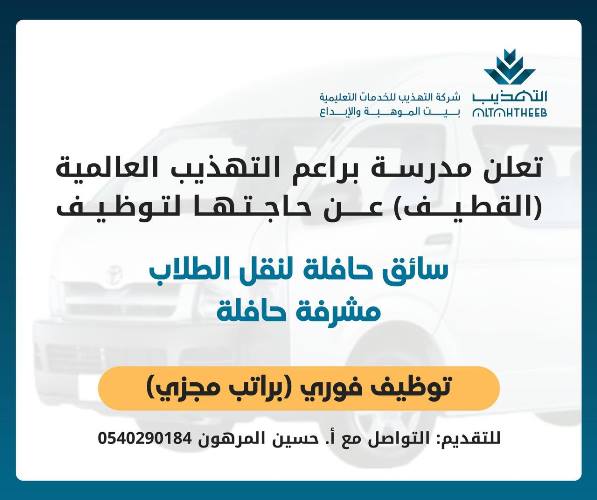 تعلن مدارس براعم التهذيب العالمية في القطيف بحي الحسين عن حاجتها لتوظيف: