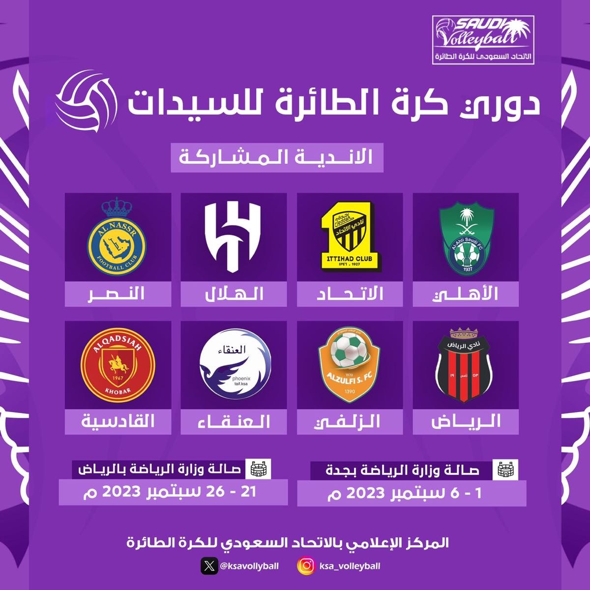 أعلن الاتحاد السعودي للكرة الطائرة جدول بطولة الدوري السعودي للسيدات، الذي ينطلق في الأول من شهر سبتمبر المقبل على صالة وزارة الرياضة بجدة، بمشاركة ثمان فرق الهلال والنصر والأهلي والاتحاد والرياض والزلفي والقادسية والعنقاء.