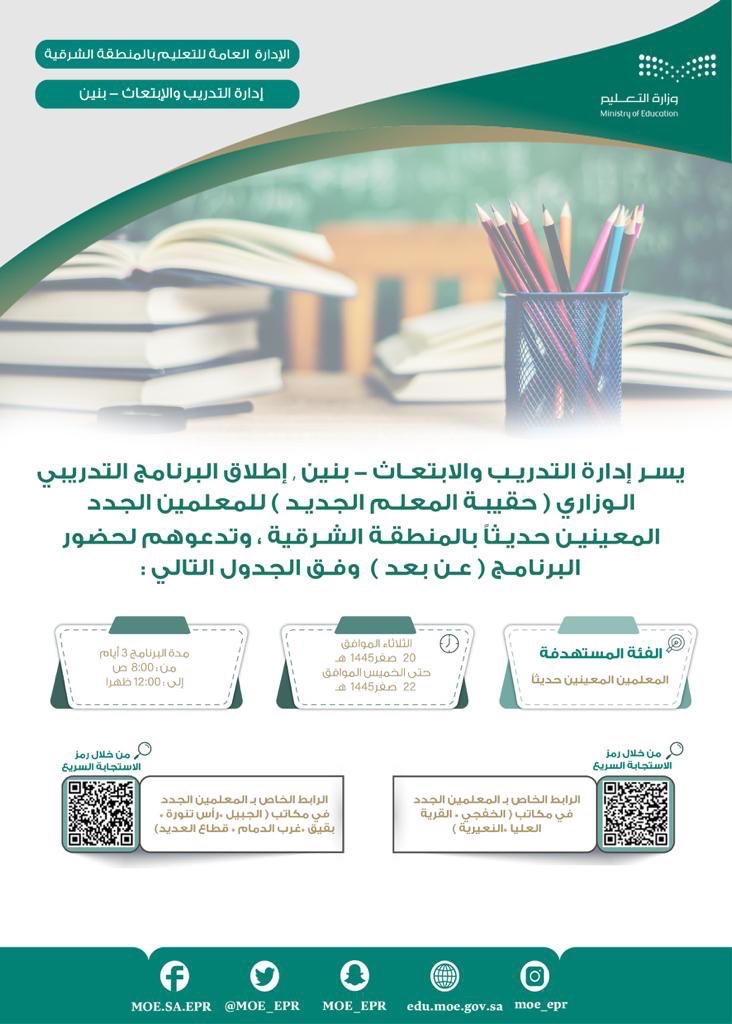 أعلنت إدارة التدريب والابتعاث ”بنين“ بتعليم الشرقية إطلاق البرنامج التدريبي الوزاري ”حقيبة المعلم الجديد“ للمعلمين الجدد المعينين حديثًا بالمنطقة الشرقية.