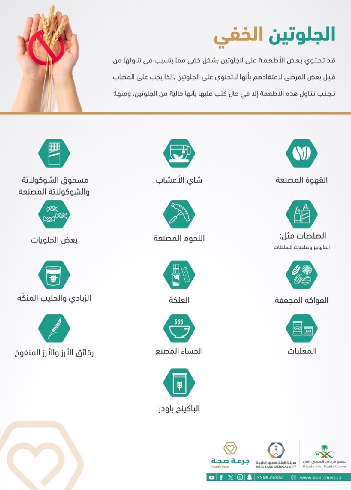 حذرت مدينة الملك سعود الطبية من الجلوتين، الذي تحتوي عليه بعض الأطعمة بشكل خفي، والتي قد يتناولها بعض المرضى.