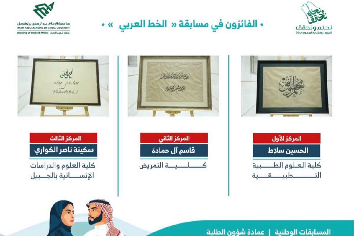 احتل ثلاثة من خطاطي القطيف المراكز الثلاثة الأولى في المسابقة الوطنية بجامعة الإمام عبدالرحمن الفيصل.