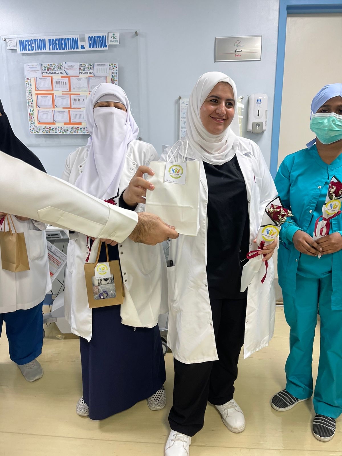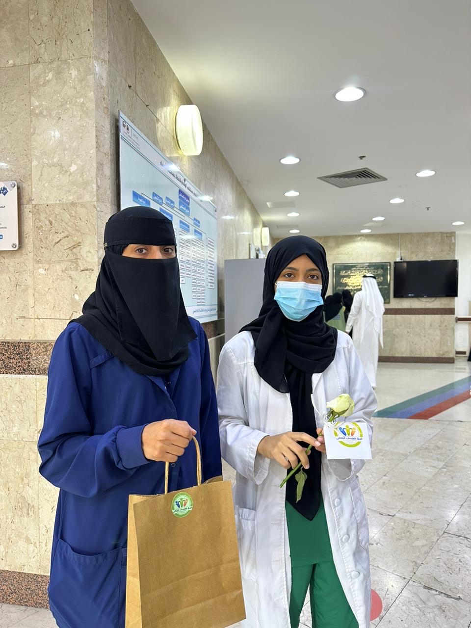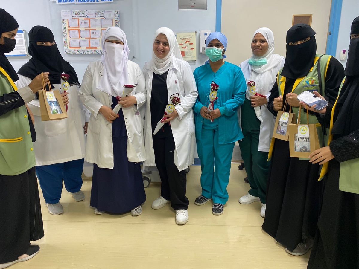 وشارك في المبادرات عدة أقسام، منها قسم الباطنية والعمليات الصغرى والعيادات الخارجية والطوارئ وقسم الأطفال، وطافت المتطوعات أرجاء المستشفيات وتوزيع الورود والتوزيعات على كافة الكوادر الطبية والموظفين بالأقسام الإدارية.