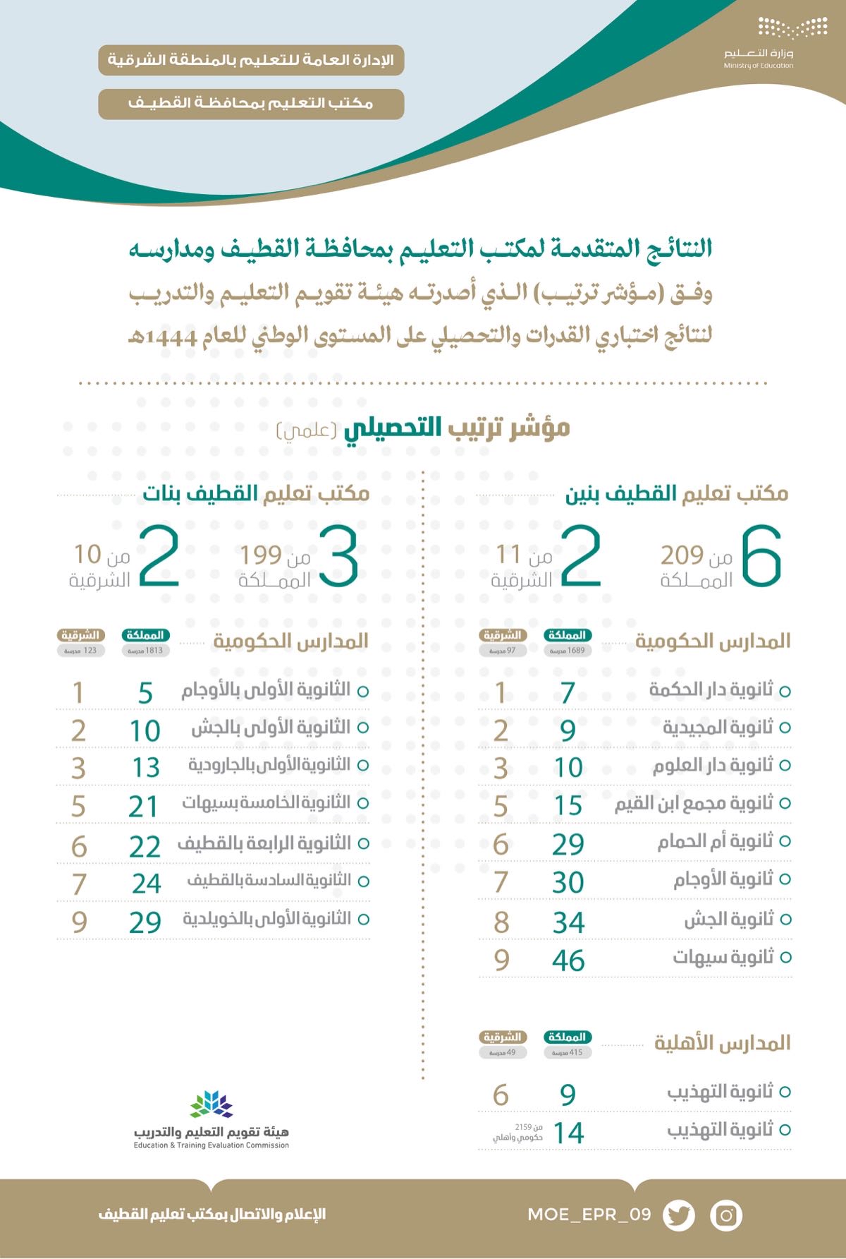 وتصدرت مدارس القطيف ب 7 مراكز في قائمة العشر المدارس الحكومية الأفضل على مستوى تعليم الشرقية في نتائج اختبار التحصيلي علمي «بنات» للعام 1444ه، و8 مراكز متقدمة للبنين.