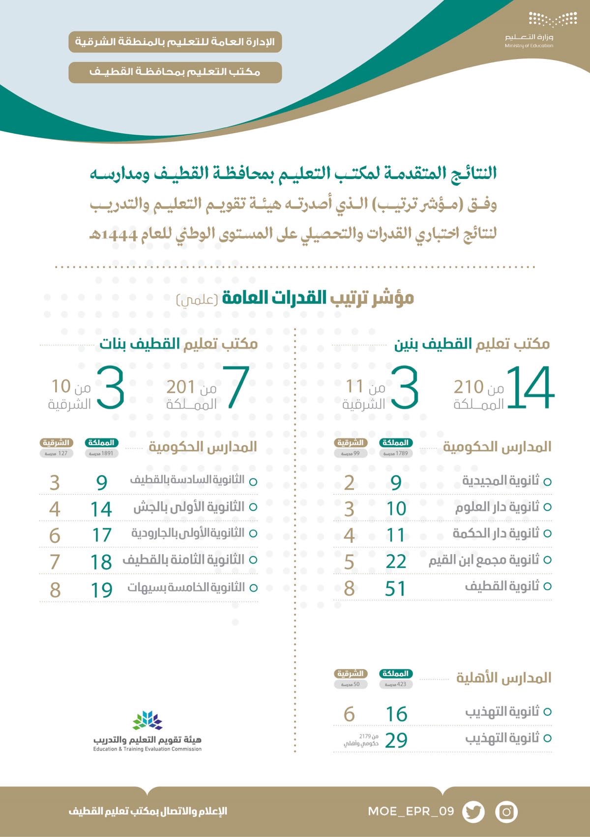 احتلت مدارس القطيف مراكز متقدمة في قوائم المدارس الأفضل على مستوى المملكة ومستوى تعليم الشرقية في نتائج اختباري القدرات العامة والتحصيلي علمي «بنين وبنات» للعام 1444ه