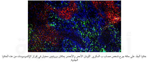 خلايا الجلد على حافة جرح شخص مصاب ب السكري. اللونان الأحمر والأخضر يمثلان بروتينين معنيان في إفراز الإكسوسومات من هذه الخلايا الجلدية.