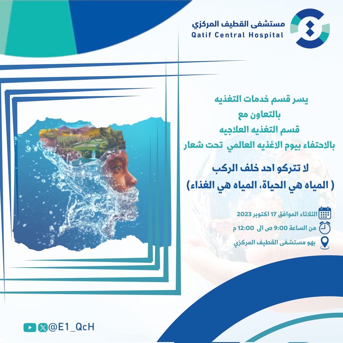 دعت إدارة قسم الخدمات الأغذية بمستشفى القطيف المركزي، بالتعاون مع قسم التغذية العلاجية، إلى الاحتفاء بيوم الأغذية العالمي، والذي يصادف 16 أكتوبر من كل عام، تحت شعار ”لا تتركوا أحد خلف الركب“.