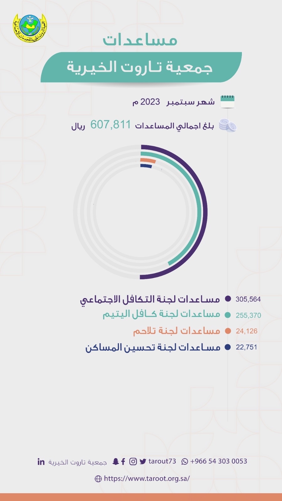 قدمت جمعية تاروت الخيرية مساعدات بقيمة 607,811 ريالا خلال شهر سبتمبر الماضي، شملت جميع لجان الجمعية ذات الصلة المباشرة مع المستفيدين.