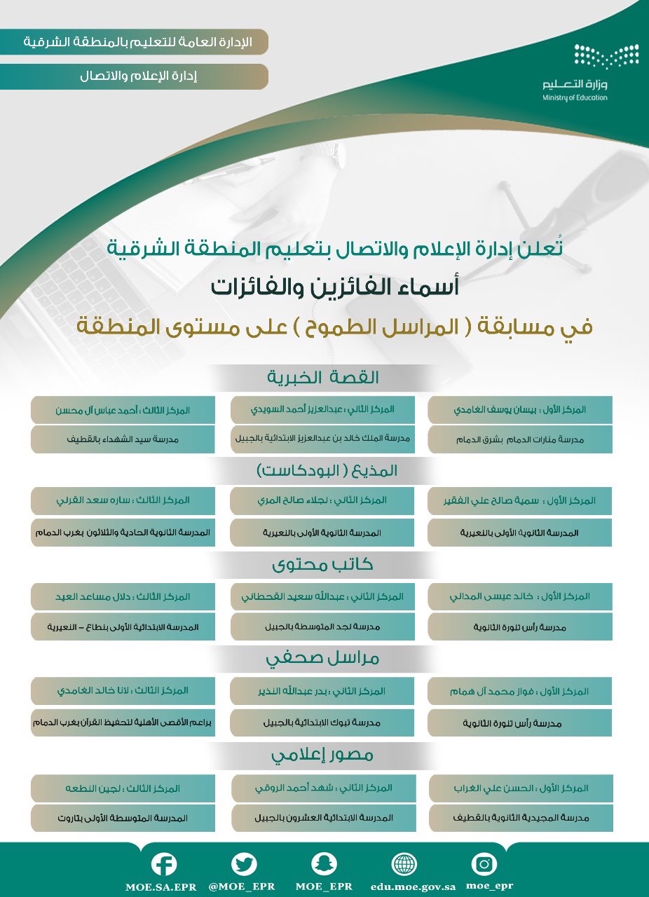 أعنت إدارة الإعلام والاتصال بتعليم المنطقة الشرقية أسماء الفائزين والفائزات في مسابقة «المراسل الطموح» على مستوى المنطقة.