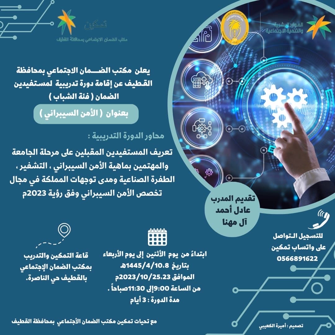 دعا مكتب الضمان الاجتماعي بمحافظة القطيف مستفيديه ومستفيدي الجمعيات الخيرية من فئة الشباب للتسجيل في دورة تدريبية بعنوان ”الأمن السيبراني“، والتي ستقام لمدة ثلاثة أيام إبتداءاً من يوم الاثنين المقبل من 9:00 إلى 11:30 صباحا بمقر المكتب في حي الناصرة.