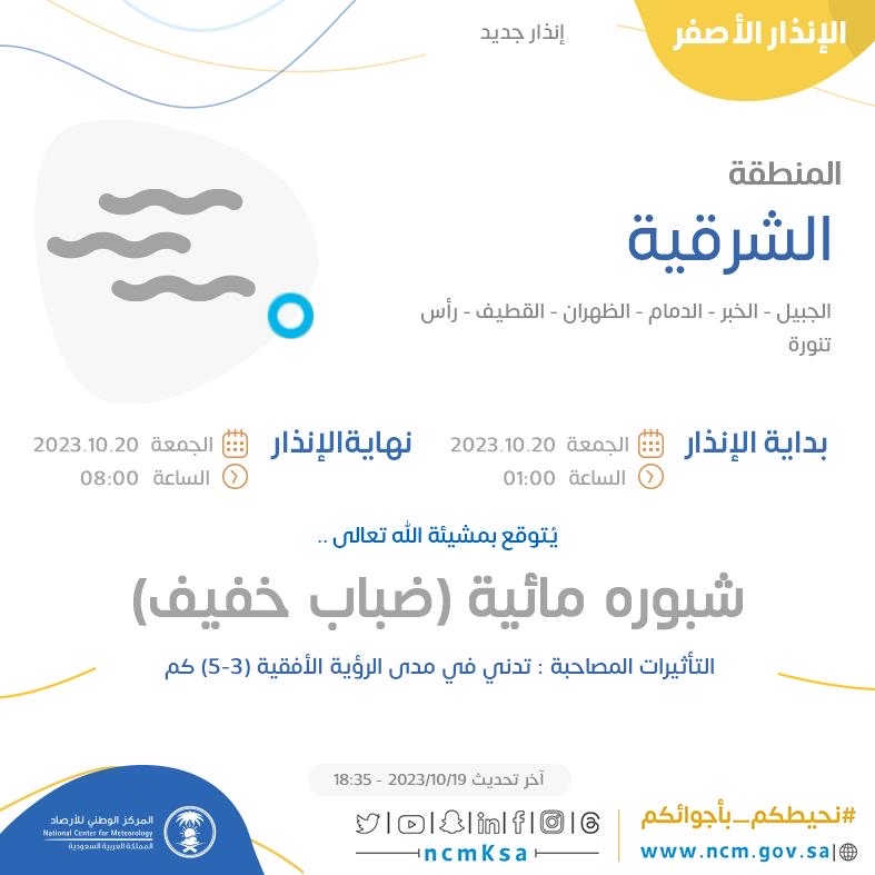 أصدر المركز الوطني للأرصاد اليوم الخميس، إنذارًا أصفر بحدوث شبورة مائية ”ضباب خفيف“ مع تدني في مدى الرؤية الأفقية على عدد من محافظات المنطقة الشرقية.
