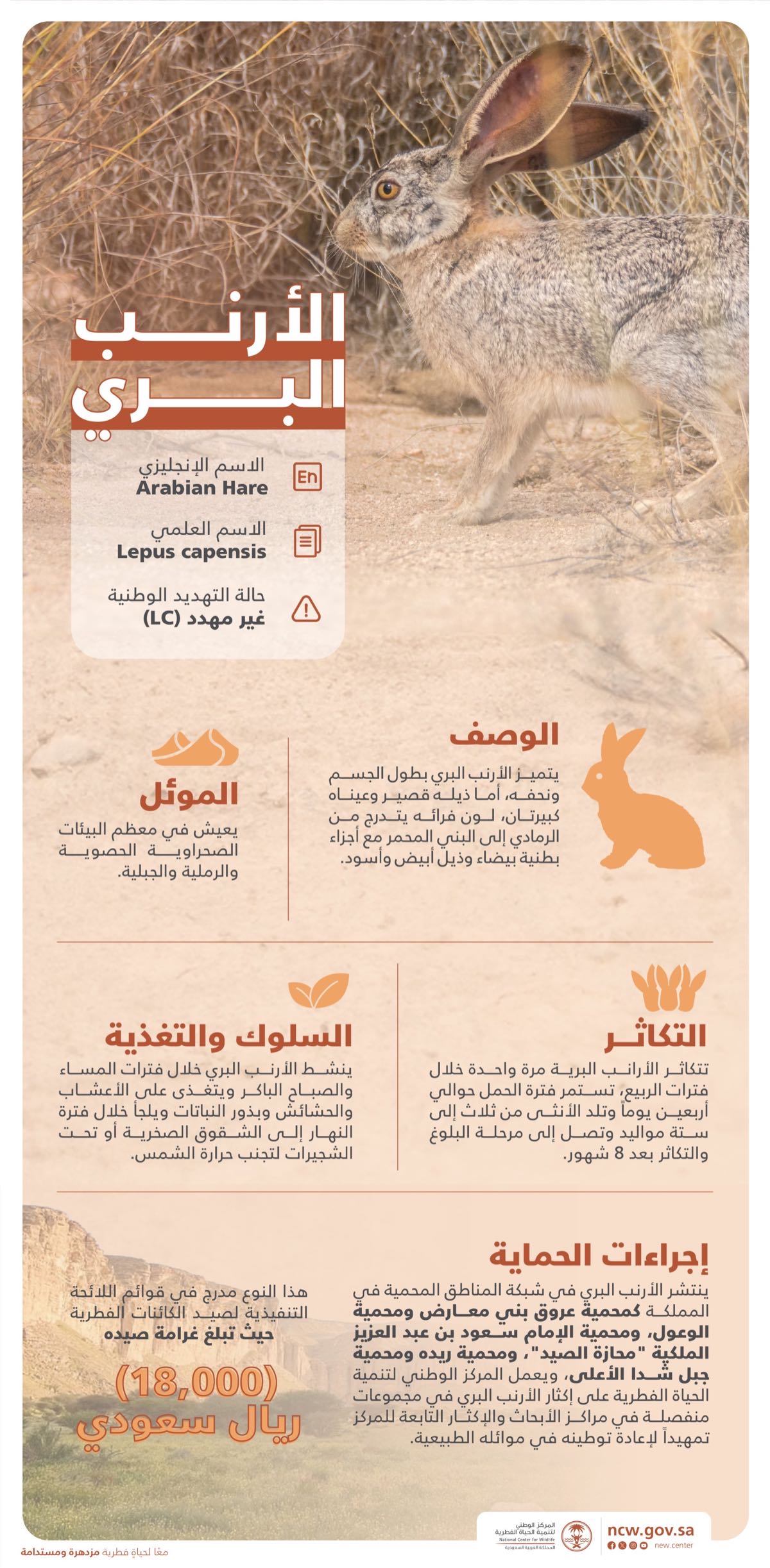 حدد المركز الوطني لتنمية الحياة الفطرية، غرامة صيد الأرنب البري، والتي تصل إلى 18 ألف ريال، باعتباره كائنا فطريا مدرجًا على اللائحة التنفيذية للمركز.
