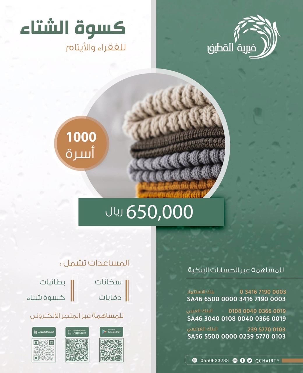 ودعت الجمعية داعمي الجمعية والخيِّرين في المجتمع إلى مد يد العون والإسهام في توفير كسوة الشتاء ومستلزماته وذلك عبر المتجر الالكتروني وتطبيقات التبرع الخاصة بالجمعية المتاحة على ”الأبستور“ و”الأندرويد“ وكذلك من خلال حساباتها المصرفية ومكاتبها المنتشرة في أحياء القطيف التابعة لها، مع أهمية إرسال صورة التحويل على تطبيق ”واتس آب“ على الرقم 0550633233 ليتم تخصيص التبرع.