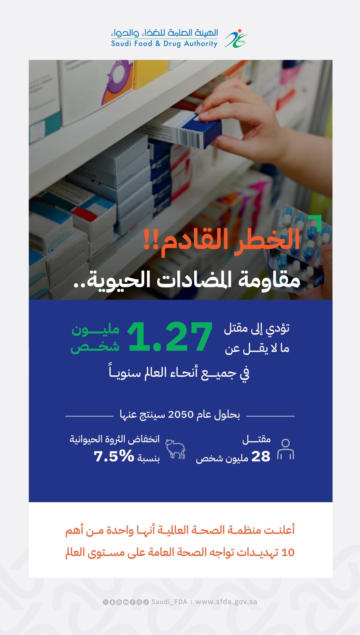 كشفت هيئة الغذاء والدواء أن مقاومة المضادات الحيوية تشكل خطرًا جسيمًا على صحة البشر حول العالم، حيث تؤدي إلى قتل مالا يقل عن 1,27 مليون شخص سنوياً.