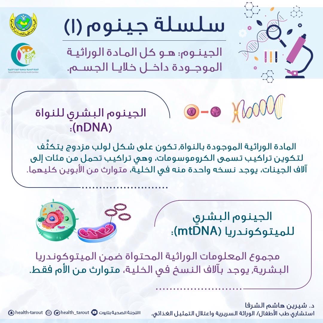 وأوضحت ”الشرفا في انفوجراف توعوي نشرته اللجنة الصحية بتاروت عبر منصة“ إكس" أن المادة الوراثية الموجودة بالنواة، تكون على شكل لولب مزدوج يتكثف لتكوين تراكيب تسمى الكروموسومات، وهي تراكيب تحمل من مئات إلى آلاف الجينات، لافتة إلى أنه يوجد نسخة واحدة منه في الخلية متوارث من الأبوين كليهما.