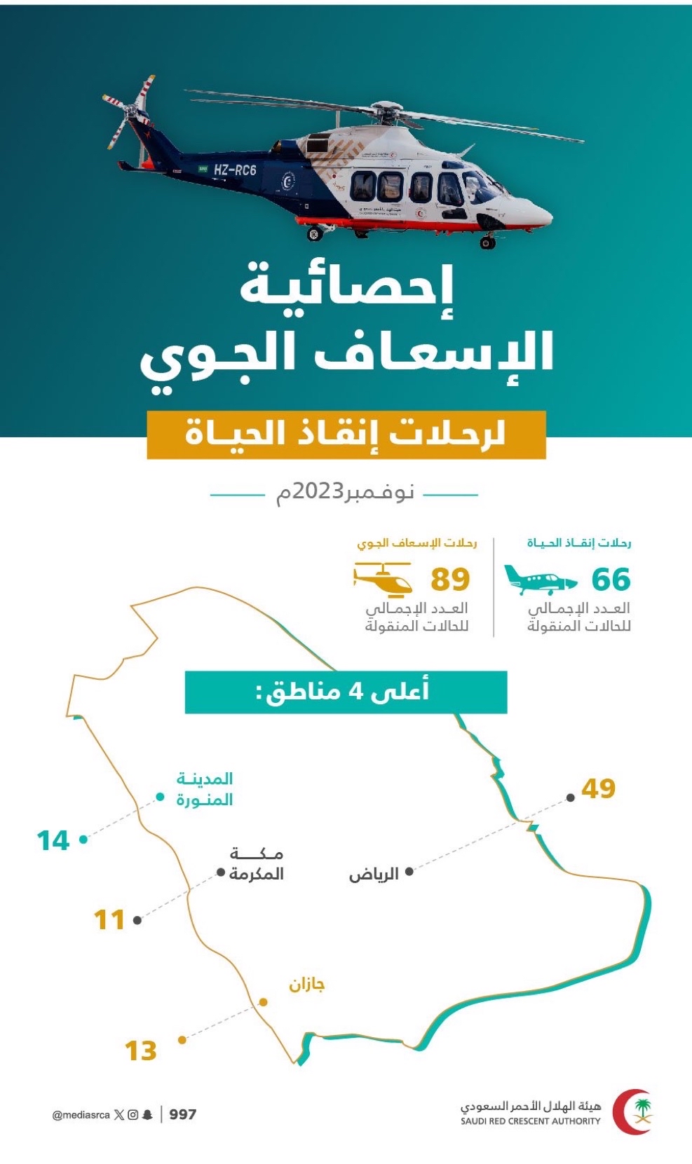 كشفت هيئة الهلال الأحمر السعودي، عن إحصائية الإسعاف الجوي لرحلات إنقاذ الحياة، خلال شهر نوفمبر 2023 م، والتي بلغت 66 حالة، فيما بلغت رحلات الإسعاف الجوي 89 رحلة.